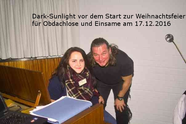 17.12.2016 Weihnachtsfeier für Obdachlose Liebe Freunde, Dark-Sunlight verabschiedet sich mit der Weihnachtsfeier für Obdachlose und Einsame am 17.12.16 von der Bühne in 2016. Gleichzeitig startete im "Modemix", Karlstr. 10 eine Sammelaktion für Bekleidung, die einen sehr großen Anklang gefunden hat. Die Kleidung wurde unserer "Boutique" zur Verfügung gestellt und durch eine Spende der Diakonie Essen erweitert. Finanzielle Unterstützung erfuhren wir durch den Verband der Bau-und Rohstoffindustrie VERO in Duisburg, durch die Essener Gaststätte "Botticelli" und viele private Spenden von Gemeindemitgliedern aus Katernberg. Auch die Bäckerei König in Gelsenkirchen, die "Getränkewelt" in der Hanielstr. 28 und das Blumengeschäft Holger Salhöfer haben unser Projekt unterstützt. In den vergangenen Jahren haben wir eine freundschaftliche Verbindung zu der Aktionsgruppe "Essen packt an" aufgebaut. Das führte dazu, dass wir in diesem Jahr unsere Gäste mit vielfältigen Drogerie- und Hygenieartikel beschenken konnten, denn EPA hat mal eben kistenweise für unsere Feier eingekauft. Natürlich sind diese Spenden wichtig um solch ein Projekt umsetzen zu können, jedoch kommen wir nun zum, aus unserer Sicht, wichtigesten Bestandteil zur Umsetzung der Feier, unsere ehrenamtlichen Helfer. In diesem Jahr konnten wir auf 68 fleißige Hände bauen, die zu 34 freundlichen Helfern gehörten. Es war förmlich spürbar, welche Freude von den Helfern ausging, die die Arbeit nicht als notwendige Pflicht, sondern als tatsächliches Vergnügen ausführten. Liebe Helfer, wir möchten nicht jeden einzeln hier aufführen, aber glaubt uns, wir sind mächtig stolz, dass wir auf Eure Hilfe zählen können. Denn diese Feier zeigt, dass trotz der in den Nachrichten gezeigten Greueltaten und Verbrechen auf dieser Welt auch noch Hoffnung besteht. Hoffnung, dass es noch sehr viele Menschen gibt, die es unseren Helfern nachmachen. Das gute Gefühl welches ein Lächeln oder der Dank unserer Gäste hervorruft ist mit keiner Kreditkarte dieser Welt zu bezahlen. In diesem Sinne freuen wir uns schon auf 2017. Wir wissen nicht, was das neue Jahr bringen wird. Wir hoffen aber, dass der am 17.12.16 erlebbare gute Geist der Weihnacht in ganz 2017 spürbar bleibt. Fotos der Weihnachtsfeier findet ihr hier auf unsere Seite. Wir wünschen allen ein friedliches neues Jahr und dass jeder Tag mehr positive Nachrichten als Horrormeldungen bereit hält. Eure Tammy und Tom Weihnachtsfeier für Obdachlose in diesem Jahr unterstützt durch "Bäcker Peter für Essen" Trauung in Witten am 06.02.16 In Haus Herbede in Witten durften wir die kirchliche Trauung von Farina und Dominik begleiten.